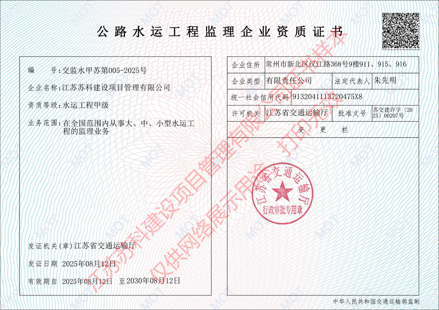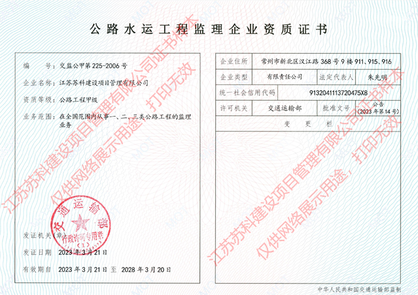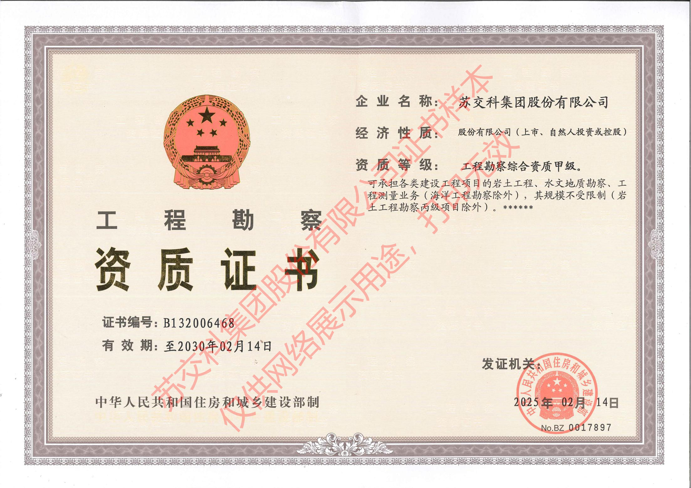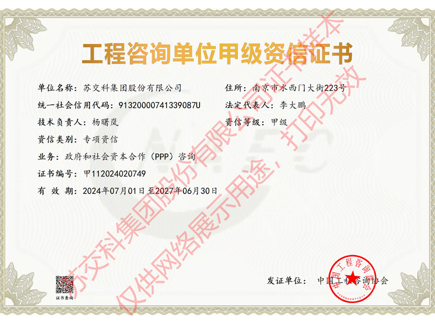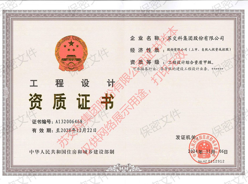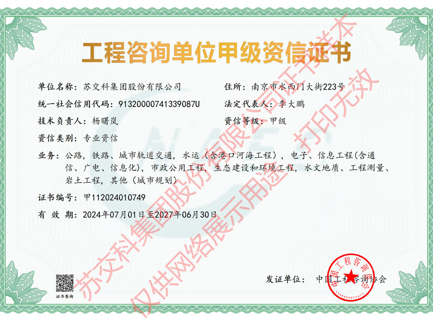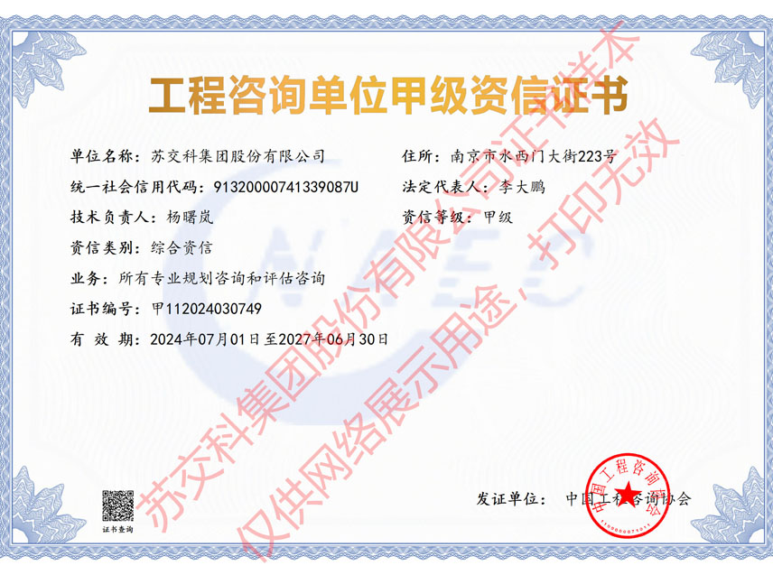 永利欢乐娱人城拥有工程行业各领域甲级资质,包括城乡规划甲级资质;工程咨询综合甲级资质;工程咨询专业甲级资质(公路、生态建设和环境工程、水文地质、工程测量、岩土工程、城市规划、铁路、城市轨道交通、港口河海工程、市政公用工程(市政交通、给排水)、水利工程、旅游工程);工程设计综合甲级资质;工程勘察综合类甲级资质;测绘甲级资质;公路工程和市政公用工程总承包一级资质;公路工程、水运工程、市政公用工程监理甲级资质;公路工程甲级、公路工程交通工程专项、水运工程材料甲级和水运工程结构甲级试验检测资质。
